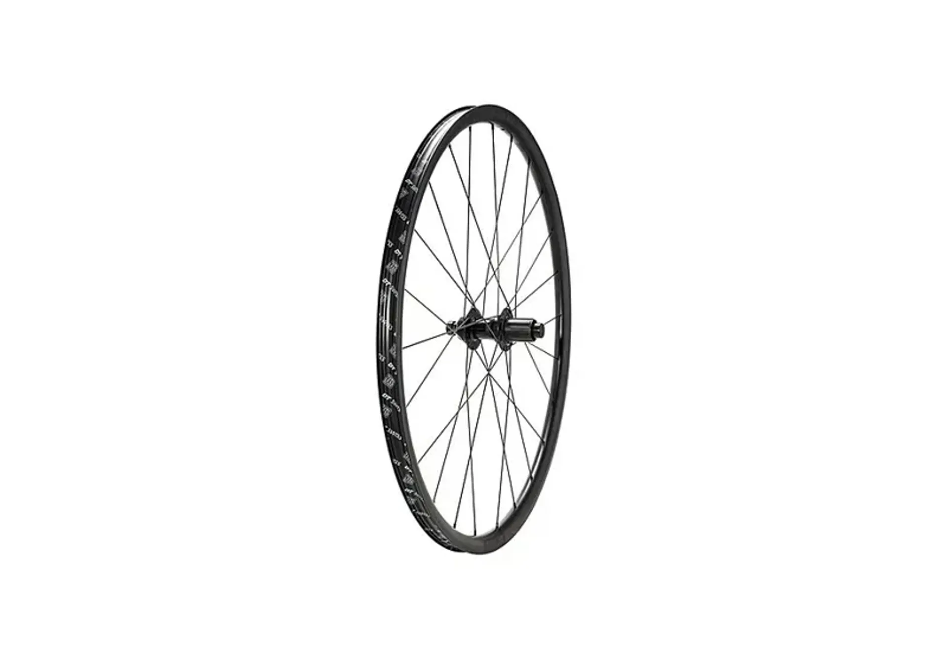 The wheel is built using a tubeless compatible DT Swiss G540 alloy rim, DT Swiss Elemental spokes, and a sealed cartridge bearing thru-axle hub with a Shimano HG freehub body.